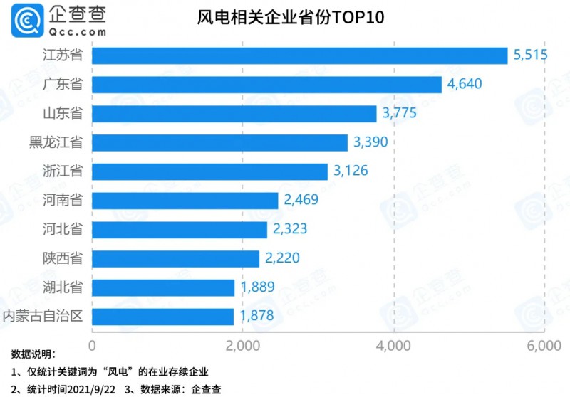 企查查数据显示,江苏省风电企业数量最多,拥有5515家相关企业,领先于全国其他省份,占全国总量的11%。广东省、山东省分别以4640家和3775家排名二三位。