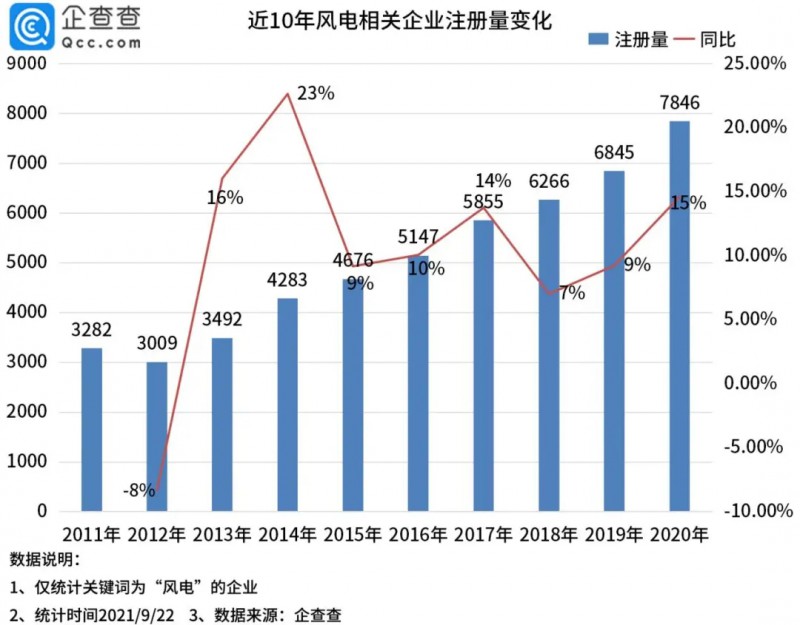 企查查数据显示,近10年来我国风电相关企业年注册量逐年攀升,2014年增速是近10年来最高的,同比增长23%。2019年注册量达6845家,同比增长9%。2020年注册量为历年来最高,达7846家,同比增长15%。