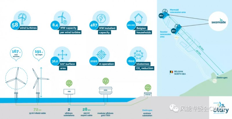 比利时SeaMade海上风电项目隶属Otary项目,属于比利时北海区域海上风电公园的组成部分,由2个独立区域Mermaid 235MW和 Seastar 252MW组成。https://www.belgianoffshoreplatform.be/en/projects/seamade/