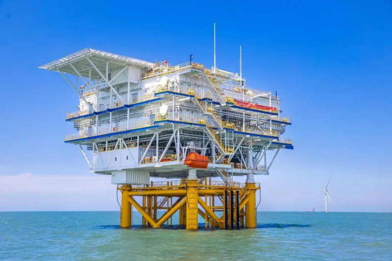 在浩瀚蔚蓝的大海里,一座色彩鲜明的海上作业平台引入眼帘,这是项目配套建设的1座220kV海上升压站。据介绍,海上升压站采用整体式布置,总重量约2800多吨,平台尺寸约为35m×33m,高约16m,在陆地整体建造,再由工程船进行海上一体化安装。
