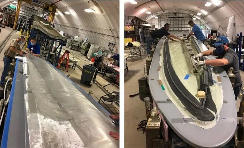 为了给热塑性风机叶片建立有效的防雷击系统,研究团队为叶片增加了铝箔层(左),并在连接处增设碳纤维加热元件(右),方便采用热焊接技术将叶片上下半壳连接为一体。