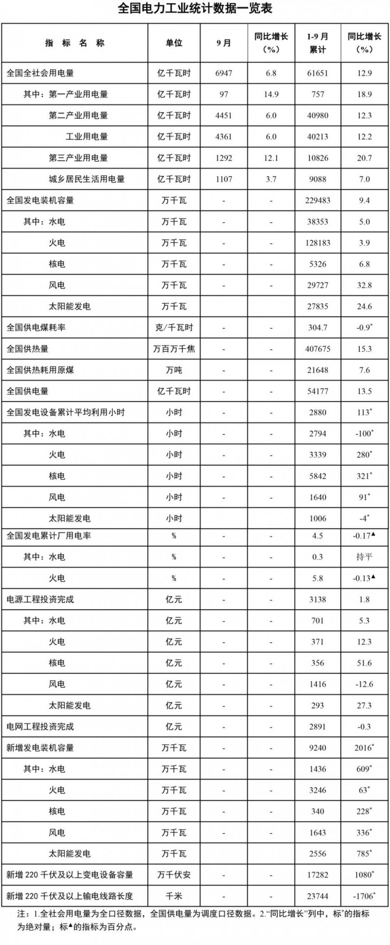10月21日,国家能源局发布1-9月份全国电力工业统计数据。截至9月底,全国发电装机容量22.9亿千瓦,同比增长9.4%。其中,风电装机容量约3.0亿千瓦,同比增长32.8%。太阳能发电装机容量约2.8亿千瓦,同比增长24.6%。