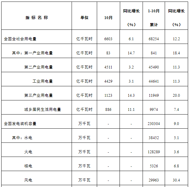 1-10月份,全国发电设备累计平均利用3180小时,比上年同期增加106小时。其中,核电6471小时,比上年同期增加372小时;风电1827小时,比上年同期增加100小时。