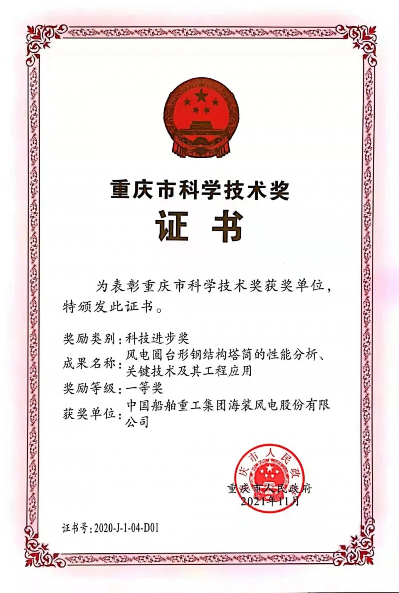 11月19日,重庆市科学技术奖励大会隆重举行。中国船舶集团海装风电股份有限公司(以下简称“中国海装”)申报的两个项目《风电圆台形钢结构塔筒的性能分析、关键技术及其工程应用》与《高效安全大型风电机组传动链关键技术与应用》均荣获重庆市科学技术奖科技进步奖一等奖。