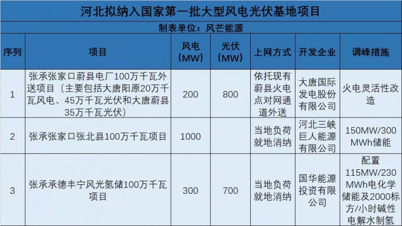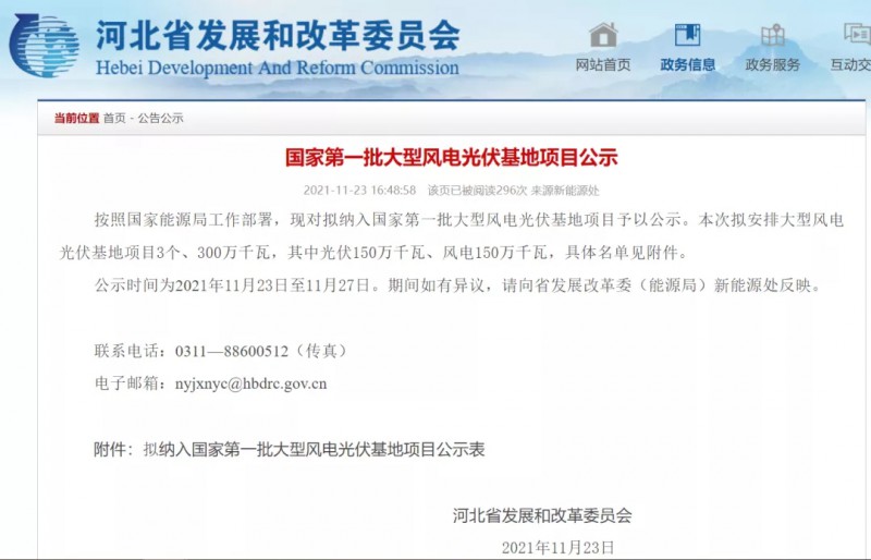 11月23日,河北省发改委公示纳入国家第一批大型风电光伏基地项目。