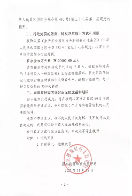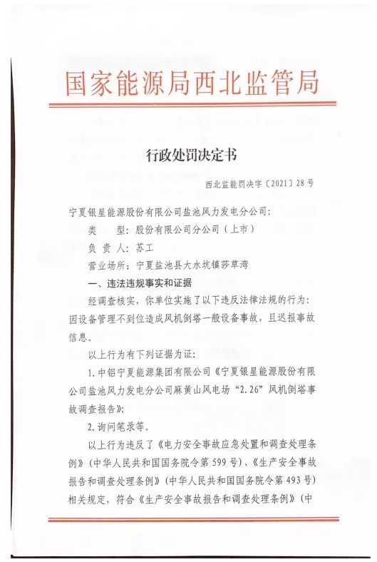 近日,国家能源局西北监管局发布【2021】28号行政处罚决定书,因设备管理不到位造成风机倒塔一般设备事故,且迟报事故信息,对宁夏银星能源股份有限公司盐池风力发电分公司罚款10万元。