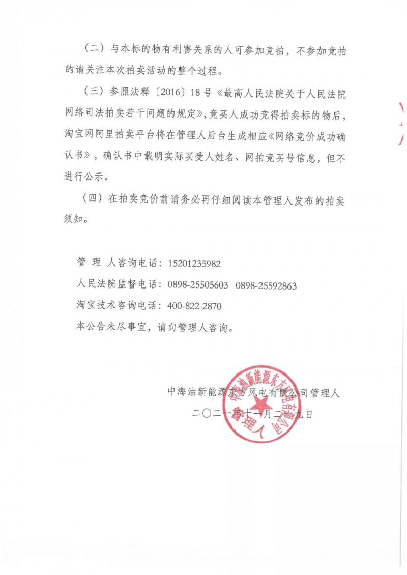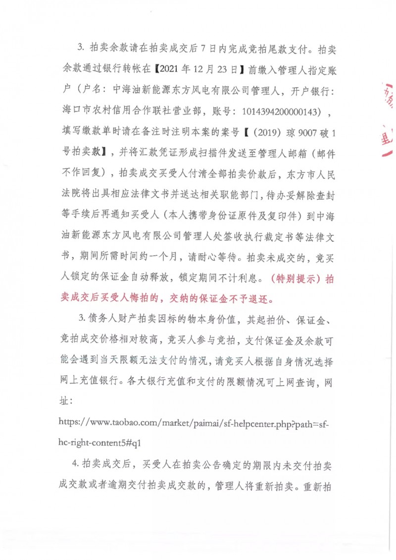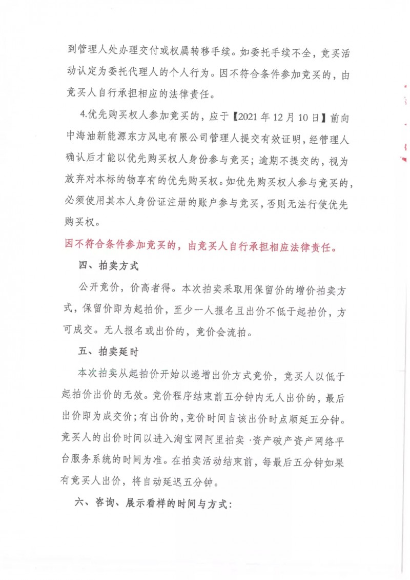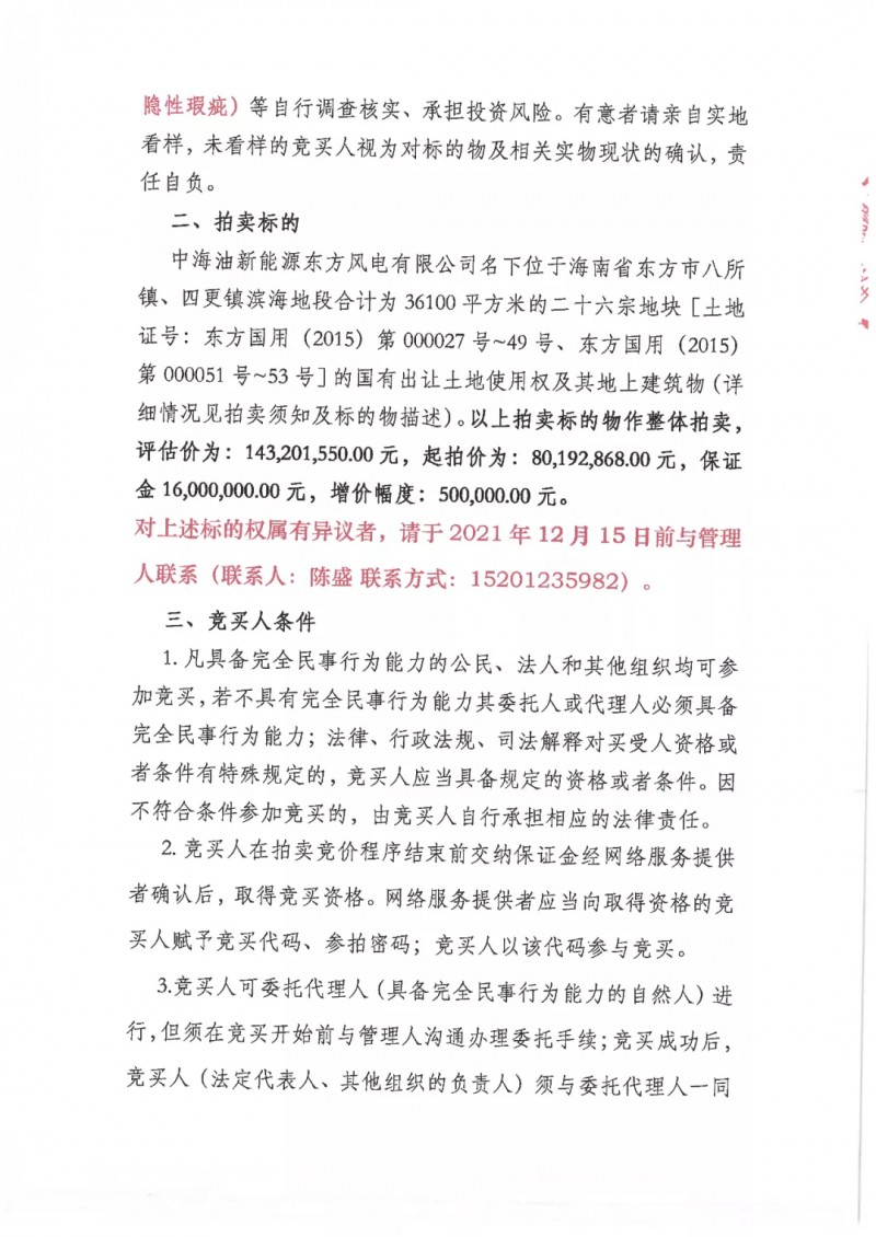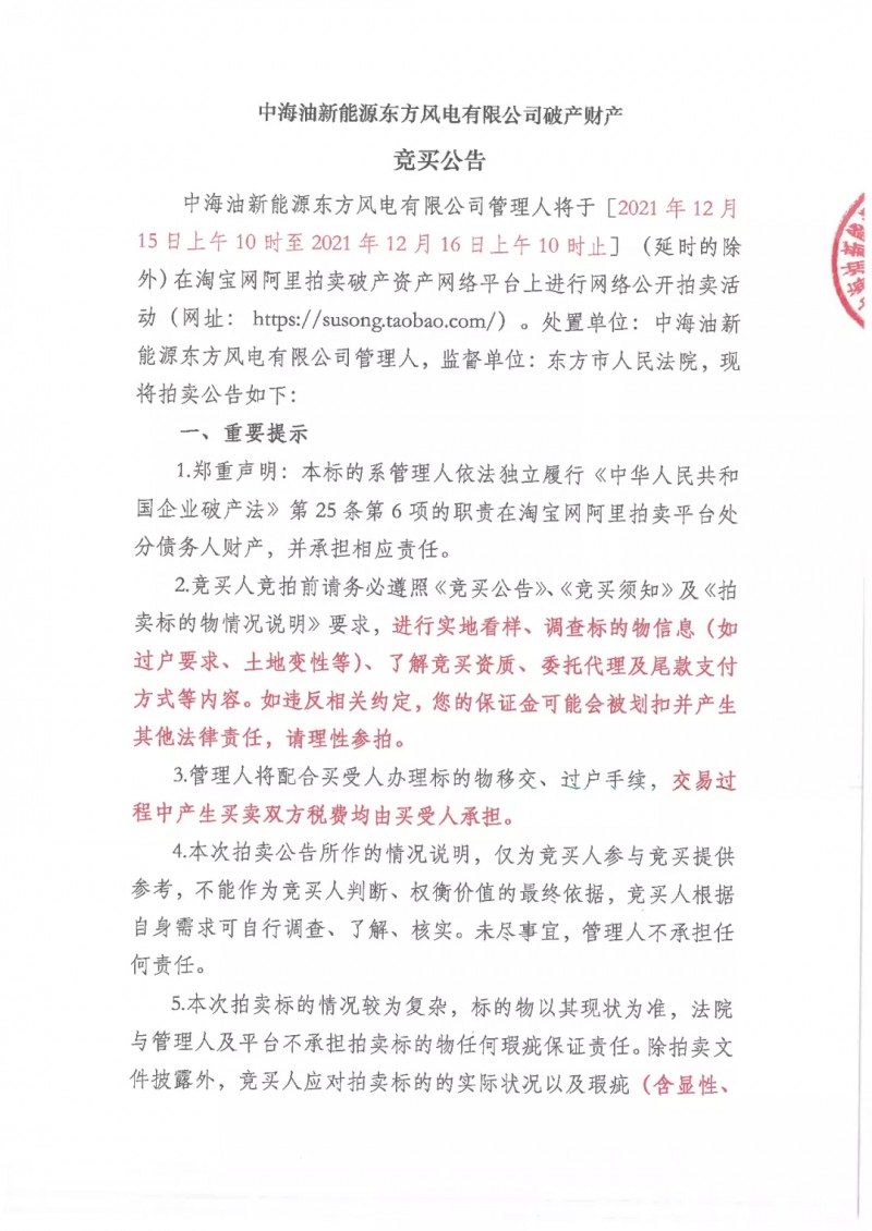 中海油新能源东方风电有限公司管理人将于[2021年12月15日上午10时至2021年12月16日上午10时止]在淘宝网阿里拍卖破产资产网络平台上进行网络公开拍卖活动。