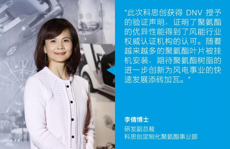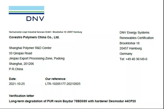 DNV 作为全球最大的独立能源专家与认证机构,是保障服务和风险管理方面的独立专家。此次为科思创颁发验证声明之前,与科思创专家组经过了长期多次的测试和数据验证。其秉持着严谨的一贯风格,最终认可了新型树脂的性能。