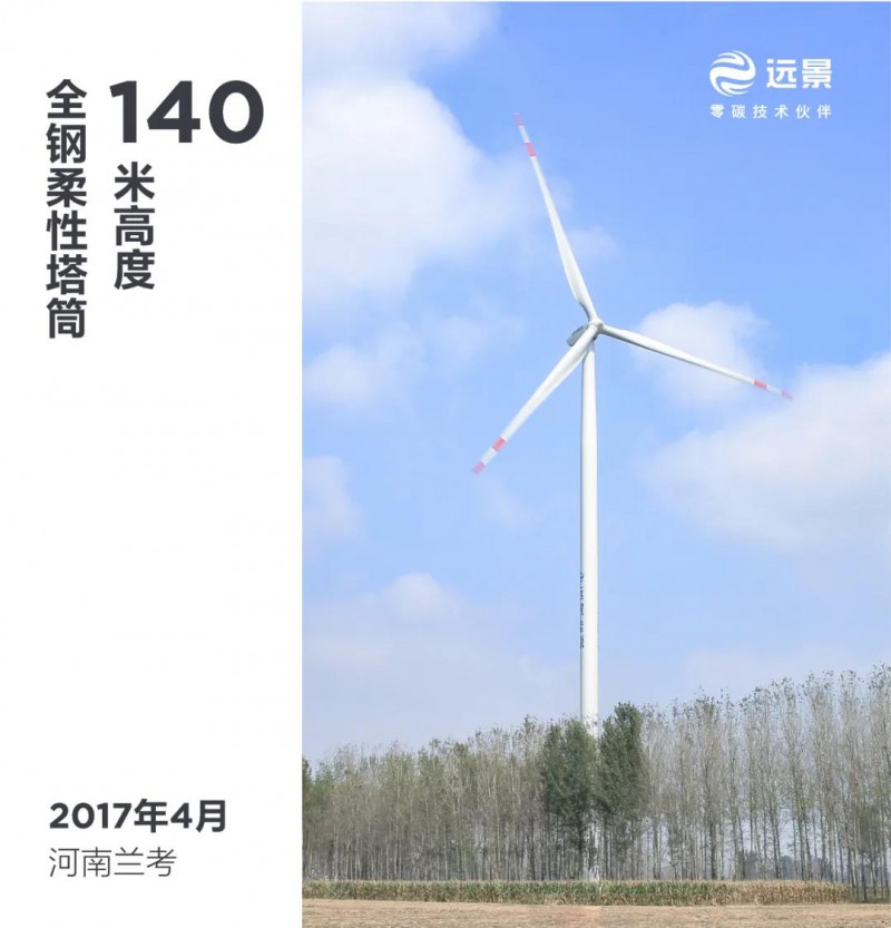 2017年4月,远景能源140米高度全钢柔性塔筒EN-121/2.2MW风机吊装创下了最高塔筒140米、最高风机200.5米的中国纪录。