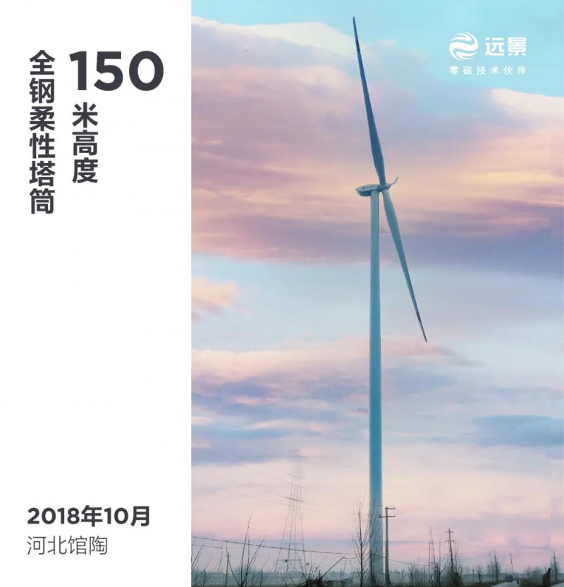 2018年10月,远景能源创造了中国风电的另一个里程碑——全国最高150米高度全钢柔性塔筒EN-141/2.5MW低风速智能风机完成机舱吊装。