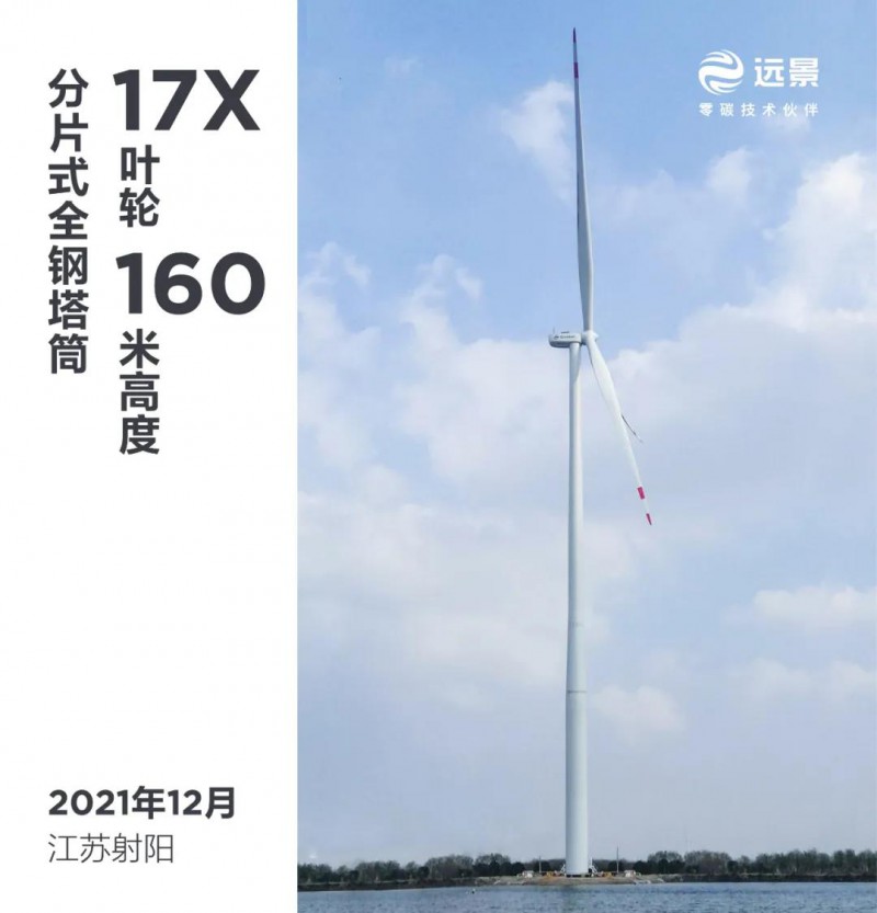 2021年12月5日,全球首个17x级别风轮、160米大直径分片式全钢塔筒智能风机在远景能源江苏射阳智慧陆上风场吊装完成,这是目前全球分片塔筒的最大风轮风机。