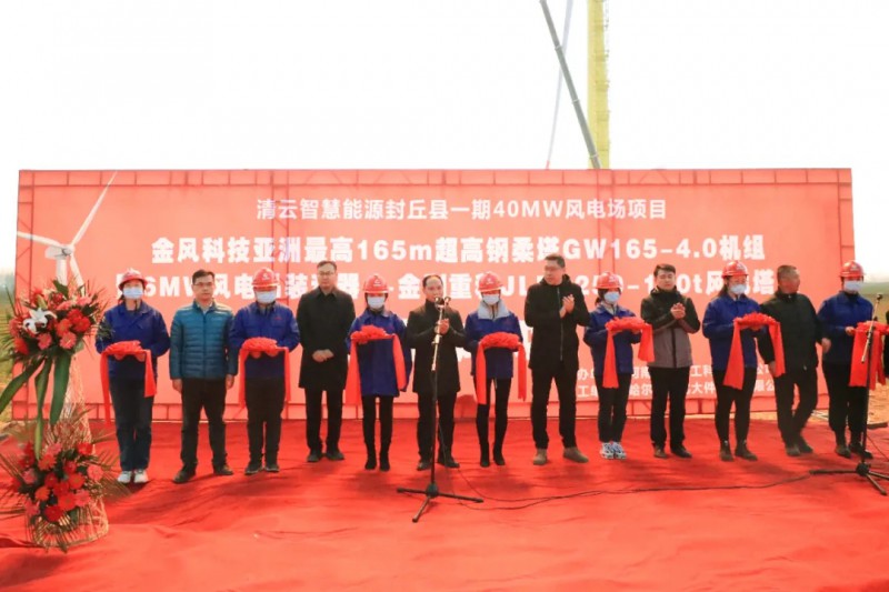 最后,与会嘉宾代表为清云智慧能源封丘县一期40MW风电场项目金风科技亚洲最高165m超高钢柔塔GW165-4.0机组暨6MW风电吊装利器--金利重科JLD2250-180t风电塔机首吊成功进行了剪彩仪式。