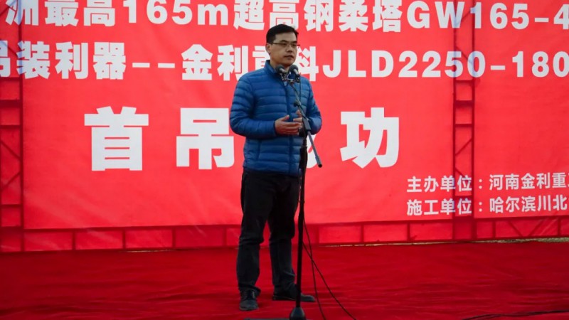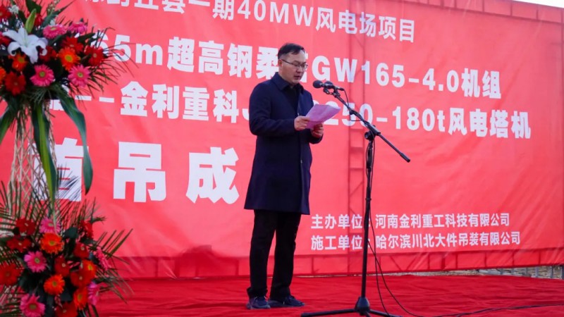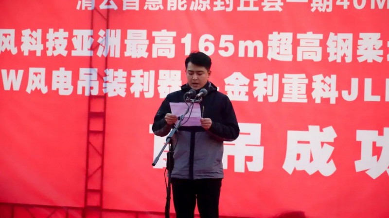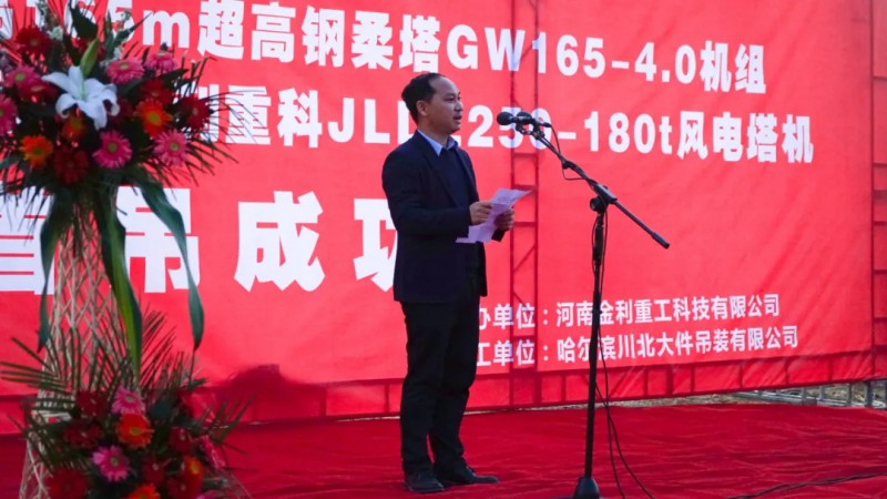 仪式上,河南金利重工科技有限公司总经理宋广表示此次成功吊装注定会在中国风电发展史上留下浓墨重彩的一笔,回顾国内风电历史,2019年风电塔机顺应风电机组大型化、高风塔发展方向,以其近200米的吊装高度、36小时的拆装转场速度、2倍于履带吊的抗风能力等优势迅速成为了高塔风电吊装的首选。