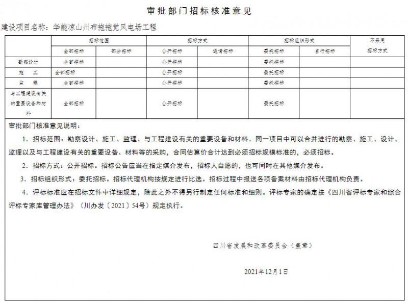 项目招标事项核准意见见附件。应严格按照《中华人民共和国招标投标法》及其实施条例、《四川省国家投资工程建设项目招标投标条例》等规定和本核准要求开展招标投标活动。