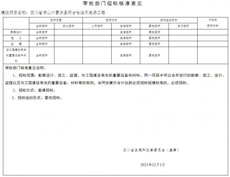 项目招标事项核准意见见附件。应严格按照《中华人民共和国招标投标法》及其实施条例、《四川省国家投资工程建设项目招标投标条例》等规定和本核准要求开展招标投标活动。