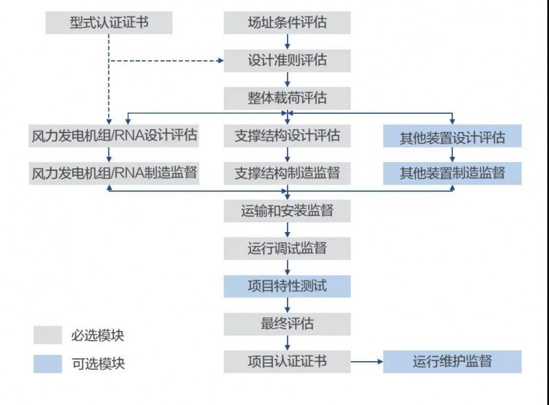 项目认证的概念早在国际电工管理委员会(IEC)于2001年发布的IEC WT01中即被定义;2010年发布的IEC 61400-22(风力发电机组一致性测试与认证)规定了风电设备与项目的认证模式包含型式认证、部件认证以及项目认证,该认证模式已成为全球风电认证体系的基石。IECRE体系成立后,IEC将项目认证的执行规则转化到IECRE OD-502 Project Certification Scheme,并于2018年撤销了IEC 61400-22标准。