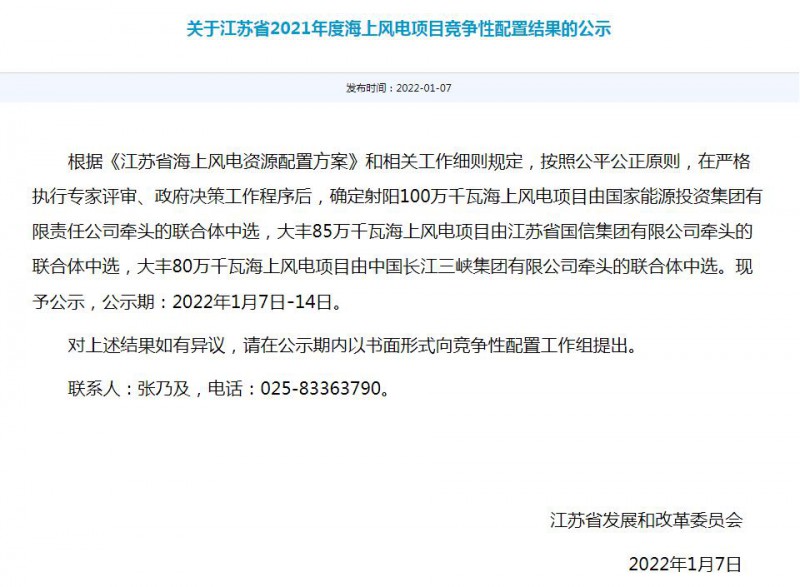 1月7日,江苏省发展和改革委员会发布了《关于江苏省2021年度海上风电项目竞争性配置结果的公示》,《公示》内容显示,射阳100万千瓦海上风电项目由国家能源投资集团有限责任公司牵头的联合体中选,大丰85万千瓦海上风电项目由江苏省国信集团有限公司牵头的联合体中选,大丰80万千瓦海上风电项目由中国长江三峡集团有限公司牵头的联合体中选。