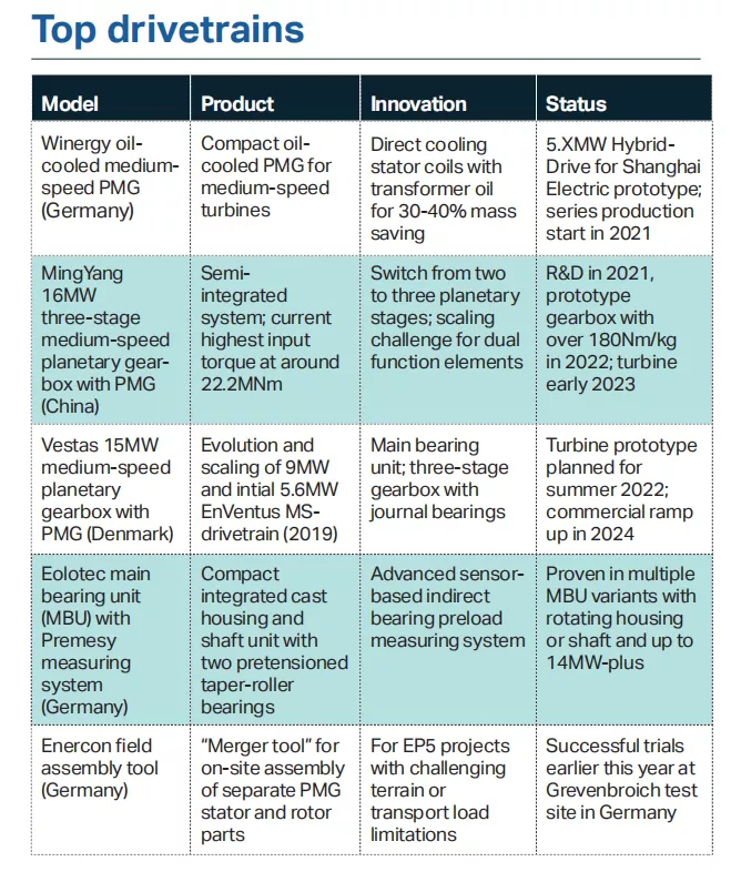 此外,明阳智能MySE16MW机组半直驱传动系统入围全球2021年度最佳传动系统奖。