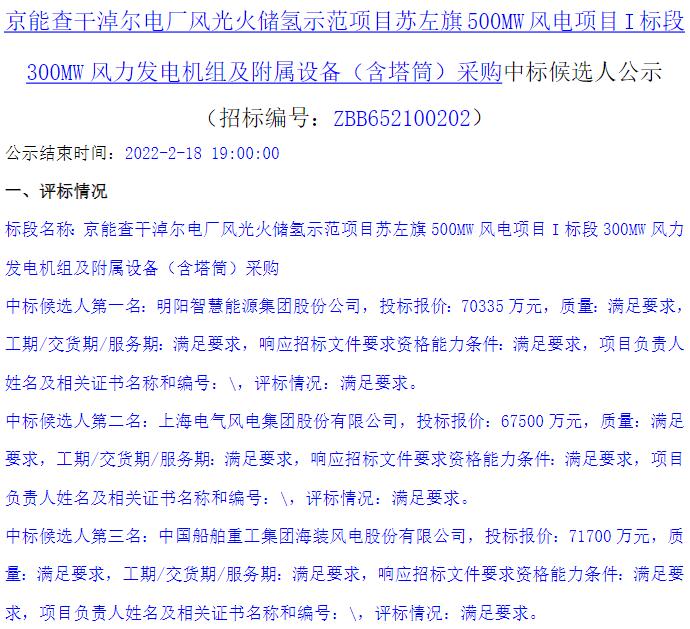 2月15日,京能查干淖尔电厂风光火储氢示范项目阿巴嘎旗300MW风电项目开标,中国海装预中标,含塔筒投标报价70800万元,折合单价2360元/kW。