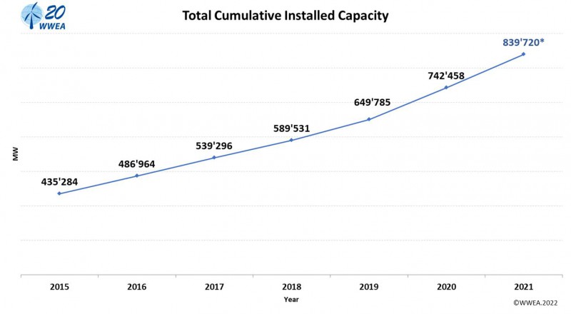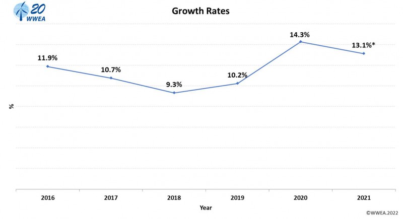 WWEA(世界风能协会)3月18日发布的初步统计数据显示,全球风力涡轮机市场在2021年再创纪录,全年全球安装的风力涡轮机总容量达97.5GW,2020年这一数据为92.7 GW。全球所有风力涡轮机的总容量现已超过840GW(2020年为742.5GW),足以提供全球7%以上的电力需求。这相当于2021年创造了13%的增长率,而一年前为14%,2019年则为10%。