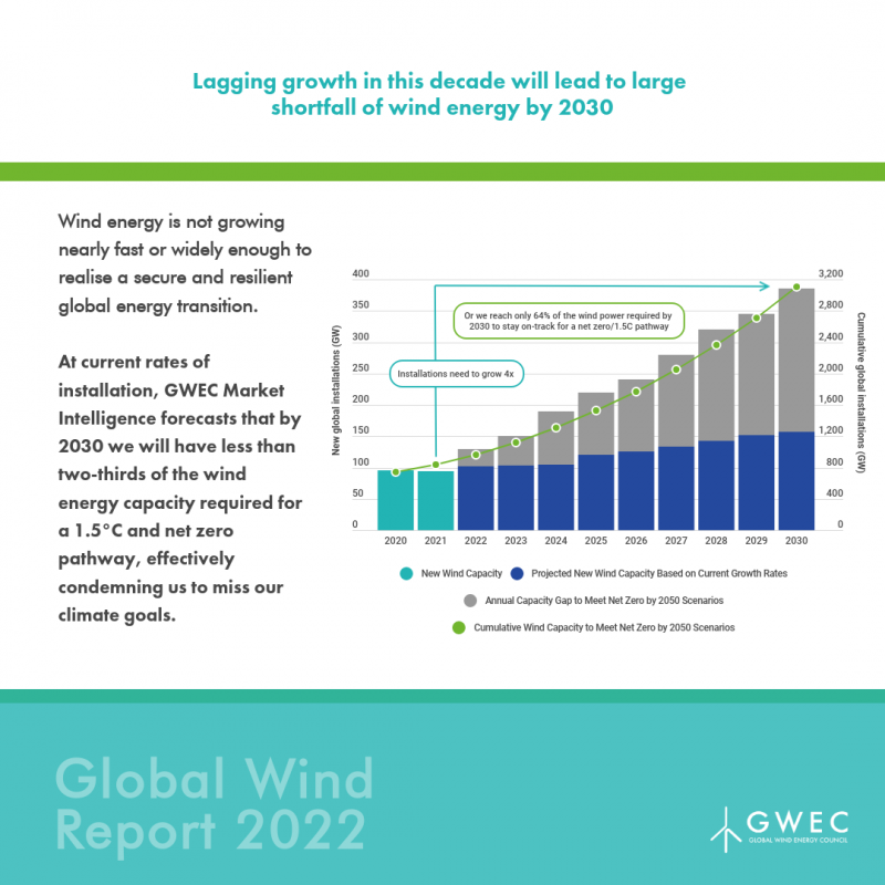 加速发展:到这个十年末(2030年),风电年装机量需要达到现在的四倍,以保证全球1.5℃温升目标的实现。
