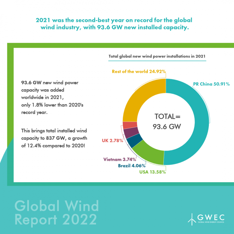 2021年全球新增近94 GW风电装机,为历史第二高年份