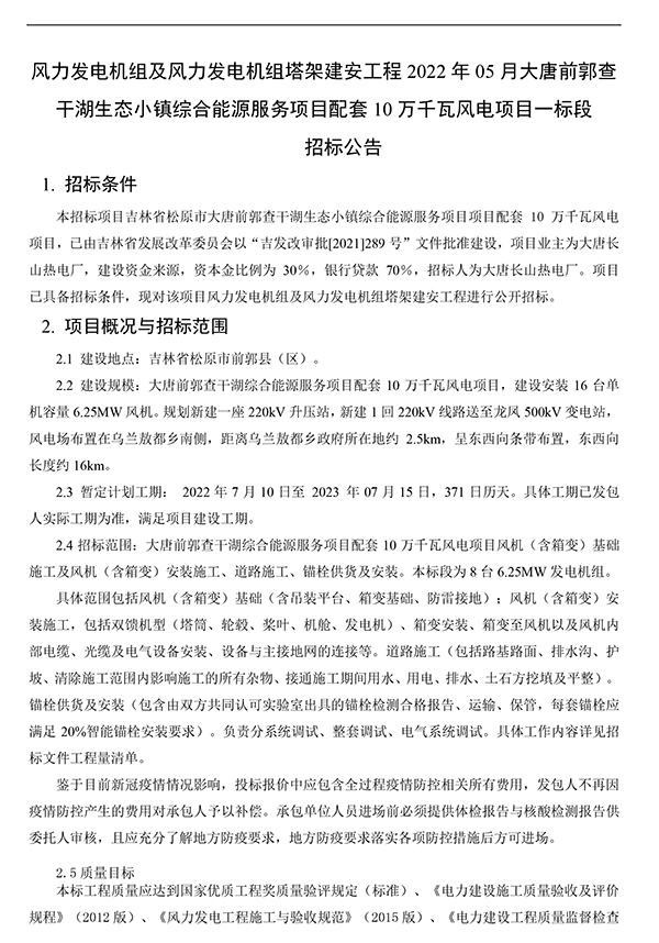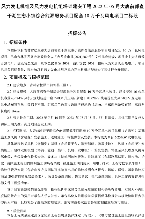 【大唐前郭查干湖生态小镇综合能源服务项目配套10万千瓦风电项目风力发电机组及风力发电机组塔架建安工程二标段】招标公告