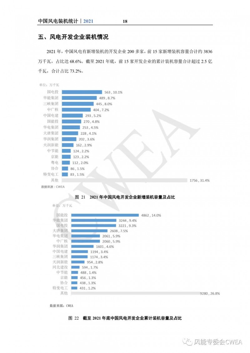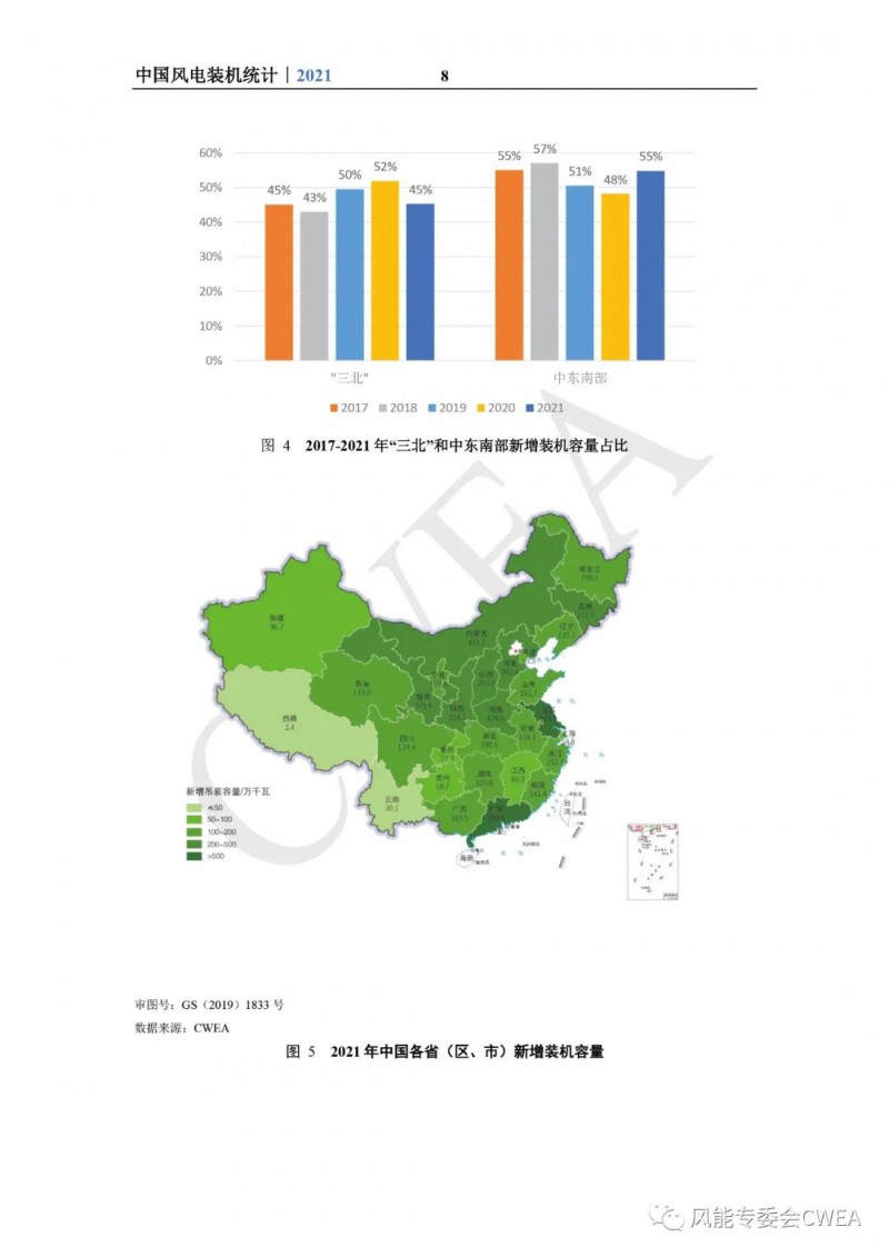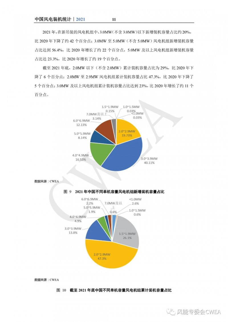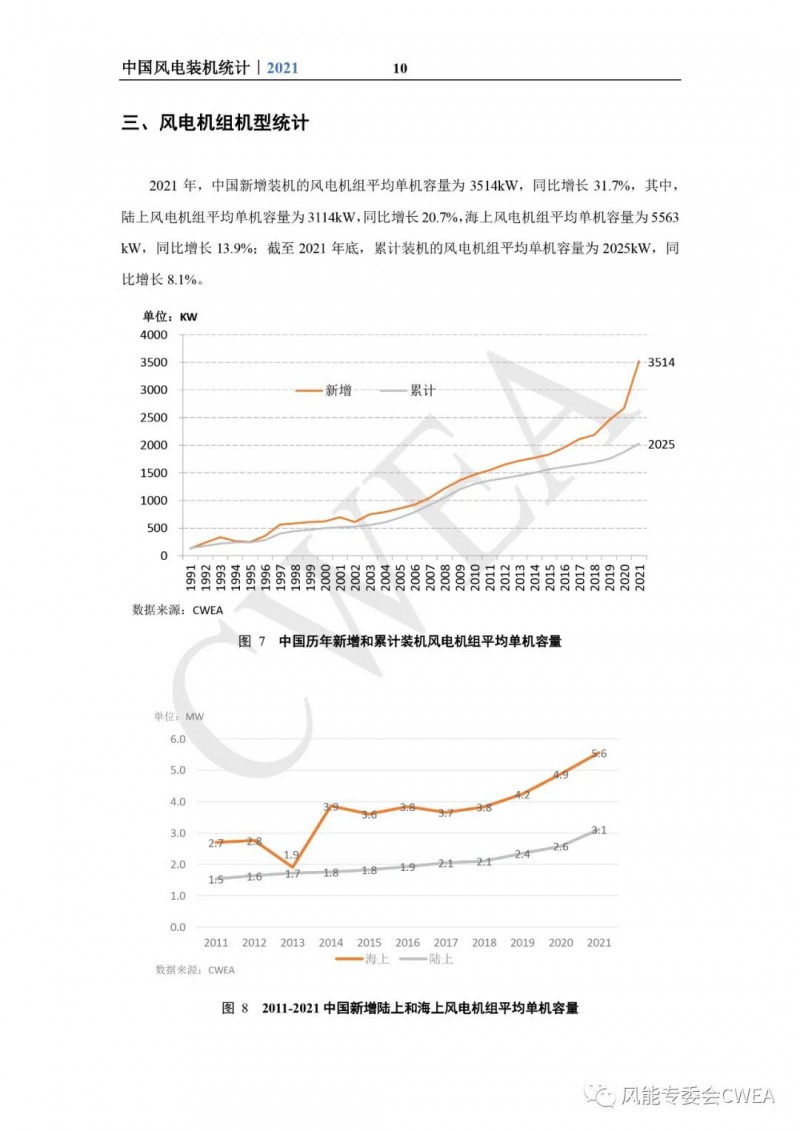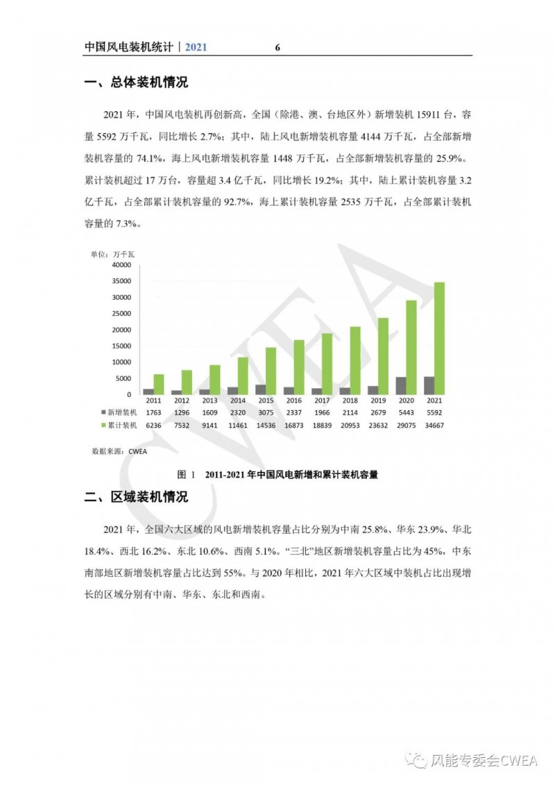 《2021年中国风电吊装容量统计简报》已由中国可再生能源学会风能专业委员会正式发布。2021年,中国风电装机再创新高,全国(除港、澳、台地区外)新增装机15911台,容量5592万千瓦,同比增长2.7%;其中,陆上风电新增装机容量4144万千瓦,占全部新增装机容量的74.1%,海上风电新增装机容量1448万千瓦,占全部新增装机容量的25.9%。累计装机超过17万台,容量超3.4亿千瓦,同比增长19.2%;其中,陆上累计装机容量3.2亿千瓦,占全部累计装机容量的92.7%,海上累计装机容量2535万千瓦,占全部累计装机容量的7.3%。