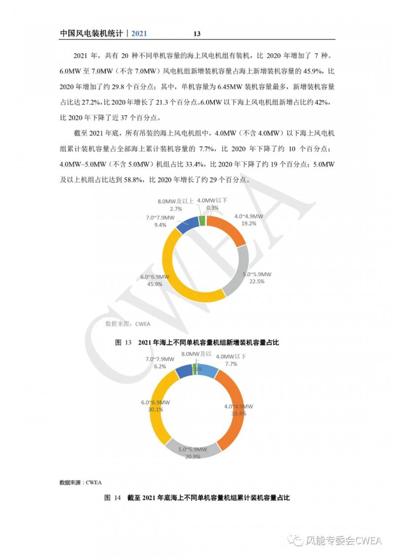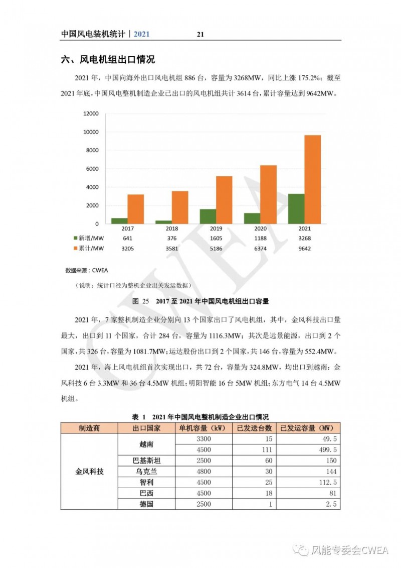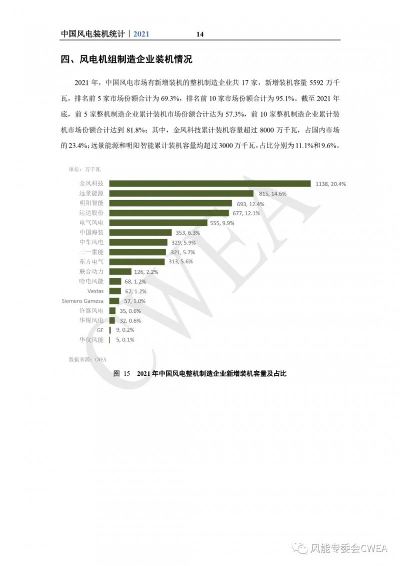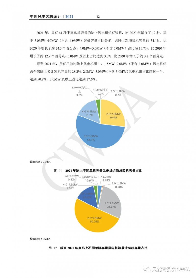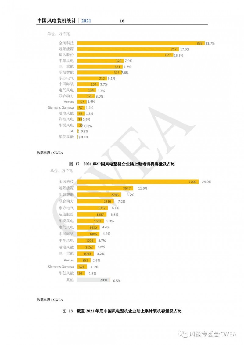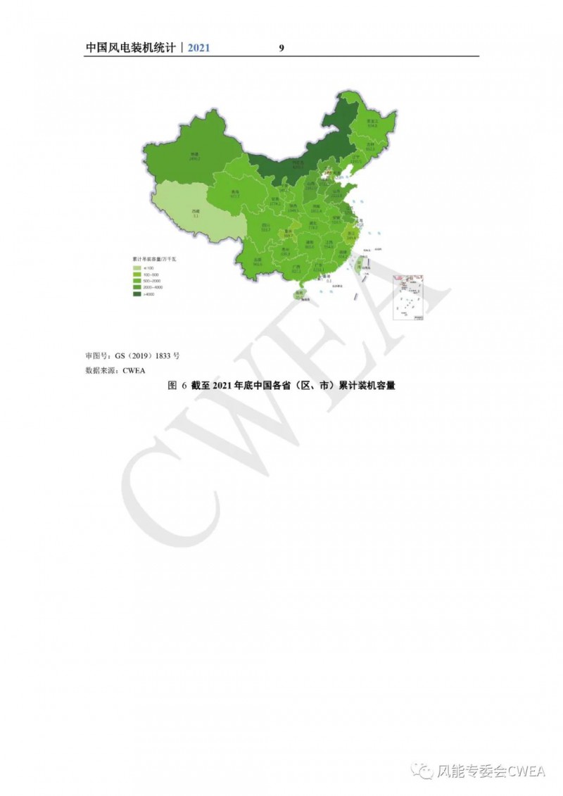 《2021年中国风电吊装容量统计简报》已由中国可再生能源学会风能专业委员会正式发布。2021年,中国风电装机再创新高,全国(除港、澳、台地区外)新增装机15911台,容量5592万千瓦,同比增长2.7%;其中,陆上风电新增装机容量4144万千瓦,占全部新增装机容量的74.1%,海上风电新增装机容量1448万千瓦,占全部新增装机容量的25.9%。累计装机超过17万台,容量超3.4亿千瓦,同比增长19.2%;其中,陆上累计装机容量3.2亿千瓦,占全部累计装机容量的92.7%,海上累计装机容量2535万千瓦,占全部累计装机容量的7.3%。