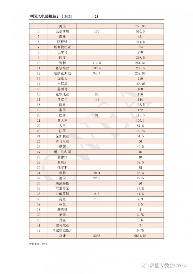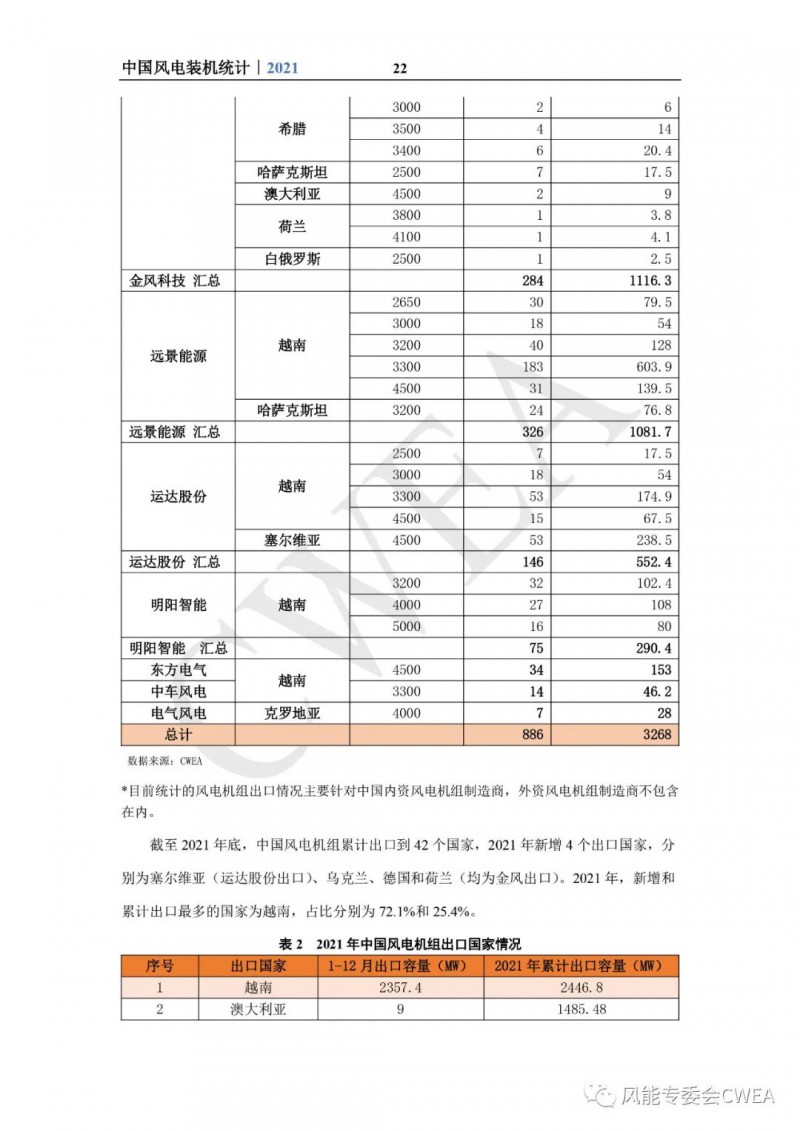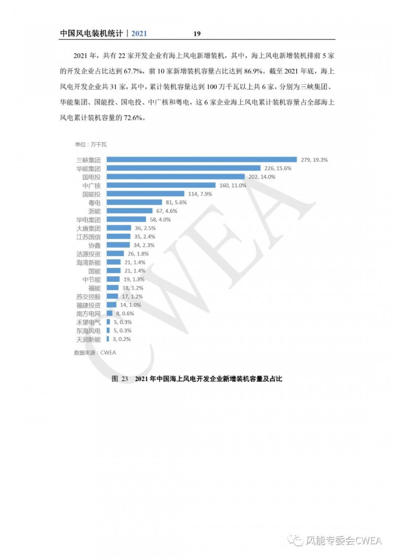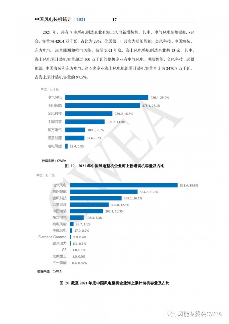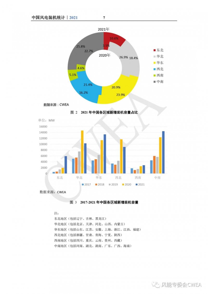 《2021年中国风电吊装容量统计简报》已由中国可再生能源学会风能专业委员会正式发布。2021年,中国风电装机再创新高,全国(除港、澳、台地区外)新增装机15911台,容量5592万千瓦,同比增长2.7%;其中,陆上风电新增装机容量4144万千瓦,占全部新增装机容量的74.1%,海上风电新增装机容量1448万千瓦,占全部新增装机容量的25.9%。累计装机超过17万台,容量超3.4亿千瓦,同比增长19.2%;其中,陆上累计装机容量3.2亿千瓦,占全部累计装机容量的92.7%,海上累计装机容量2535万千瓦,占全部累计装机容量的7.3%。