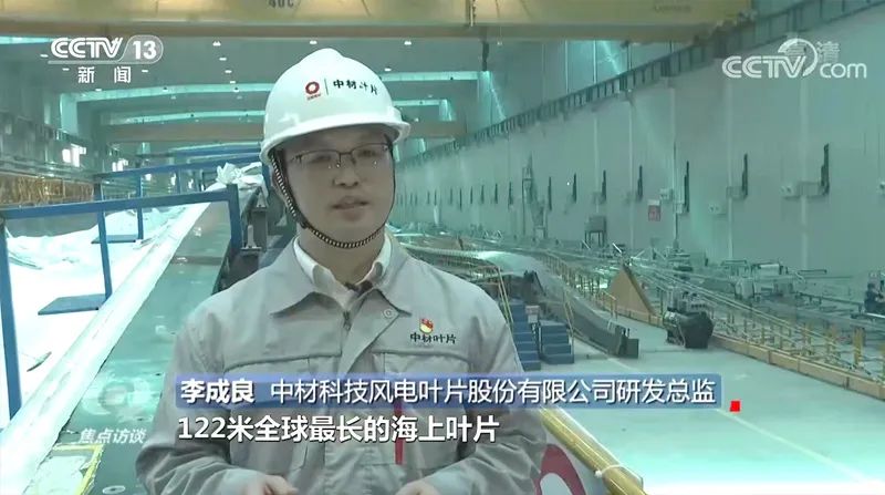 中材科技风电叶片股份有限公司研发总监李成良说:“现在正在生产的是122米,全球最长的海上叶片,这个叶片采用了最先进的高性能翼型和碳纤维拉挤技术研发而成。”