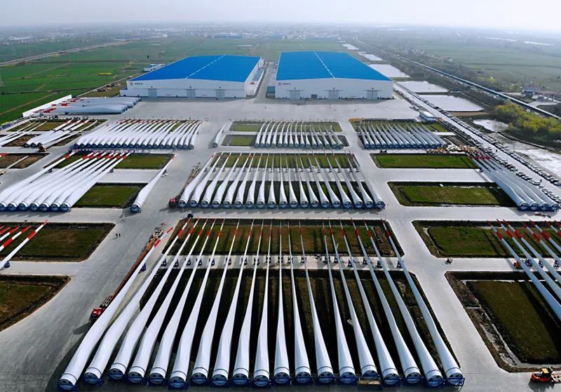 中材科技风电叶片股份有限公司在江苏阜宁的工厂,是亚洲最大的风电叶片供应基地。车间里,工人们在进行叶片的蒙皮铺设,他们生产的是93.2米长的叶片,而在另一个车间里,全球最长的海上叶片已初具雏形。
