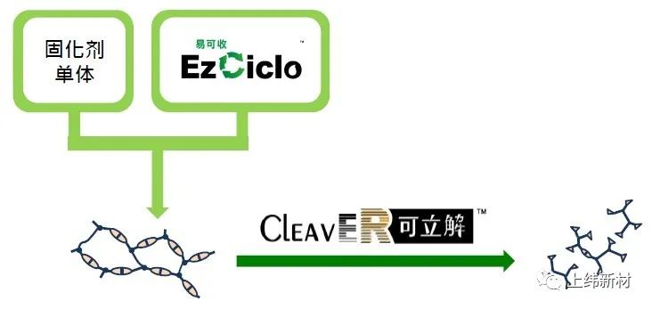 新型EzCiclo可回收热固树脂发生交联聚合反应后,形成三维网状结构高聚物;该高聚物在CleaVER降解体系的作用下,降解成小分子量的寡聚物;对该寡聚物进行整理后,可重新回到新型EzCiclo可回收热固树脂体系中,降解过程中,无废液废水产生,可重复循环利用。
