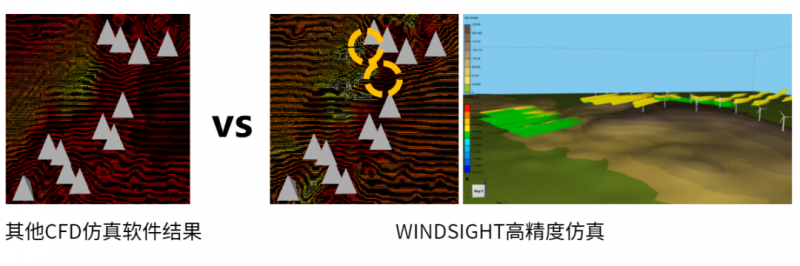 WINDSIGHT平台以数字化赋能风电场设计的本领绝非空口无凭,它已在多个项目中展示出了强大的能力。安徽某50MW复杂山地风电场采用WINDSIGHT平台高精度流动仿真系统,相较行业内其他CFD软件,更精准地捕捉了复杂流动现象;利用并行云计算,将计算时间由常规的12小时缩短至3小时。内蒙古某450MW风电场,场区容量大,居民区、耕地、保护区众多,人工方式难以实施高效优化。利用WINDSIGHT平台风电场优化功能,实现了自动化、智能化混排优化及禁排区域避让,最优混排方案年发电量(AEP)提升量达到2.17%,平准化度电成本(LCOE)降低达到3.22%。