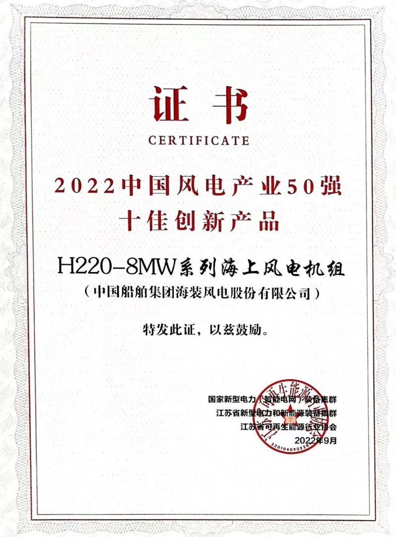 此次获奖的H220-8MW系列海上风电机组是中国海装面向超大型深远海环境开发的第一款海上风电平价机型,具有轻量化、智能化、高经济性、高可靠性等优势特点。机组拥有完全自主知识产权,已形成专利26项,其中申请发明专利21项,获授权专利12项,可应用于滩涂、近海、深远海等各类风区海域。