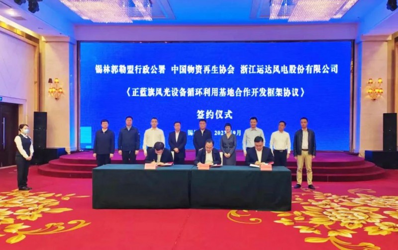 会谈现场还举行了签约仪式,锡林郭勒盟行政公署与中国物资再生协会以及运达股份,就正蓝旗风光设备循环利用基地合作开发签署框架协议,正蓝旗人民政府与运达股份签署合作项目开发协议。