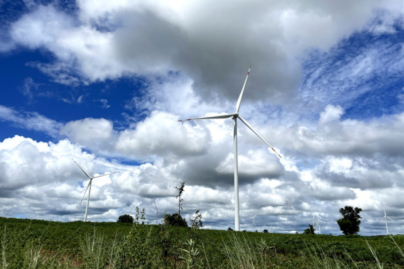 在泰国东北部连绵起伏的山丘上,32座高约120米的白色风力发电机错落排开,巨大的叶片迎着风缓慢转动。这是中国公司在泰运维的猜也蓬风电场项目的一部分。