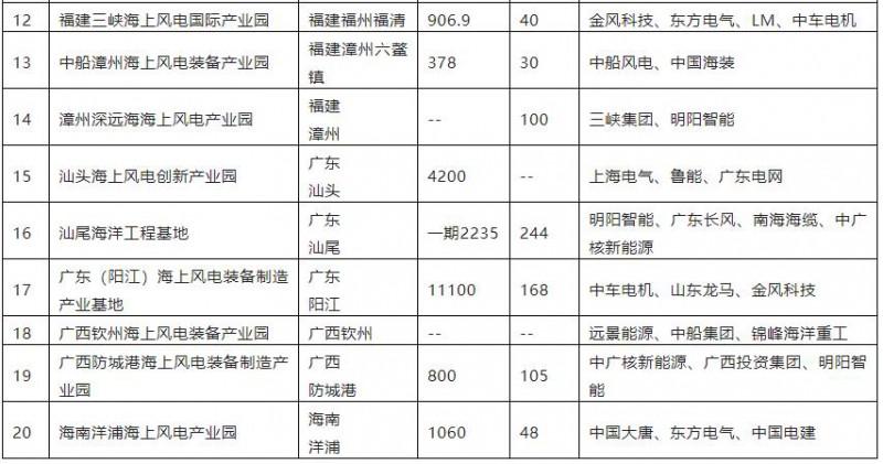近年来,国内多个沿海省份已开始加速布局海上风电装备产业园/基地。根据现有公开资料不完全统计,本文梳理了国内20家主要的海上风电装备产业园/基地的总体情况,对其地理位置、占地面积、预计总投资额、主要入驻企业等关键信息进行了列表汇总,并绘制了我国主要海上风电装备产业园/基地分布图(图1)。