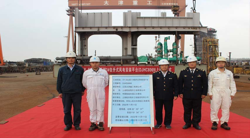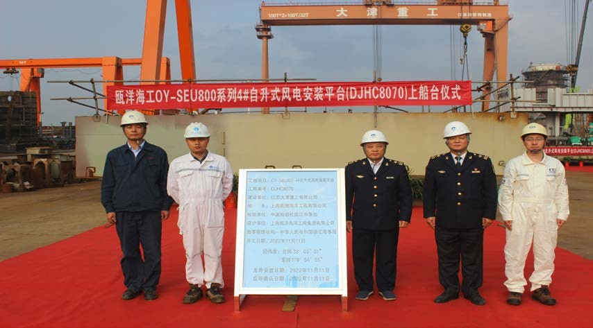 当天下午13点58分,瓯洋海工OY-SEU800吨系列3#、4#自升式风电安装平台(DJHC8069/8070)项目上船台仪式在室外船台举行。镇江海事局,中国船级社镇江办事处,瓯洋海工代表,ABL监理公司及大津重工项目建造团队共同出席了此次仪式。