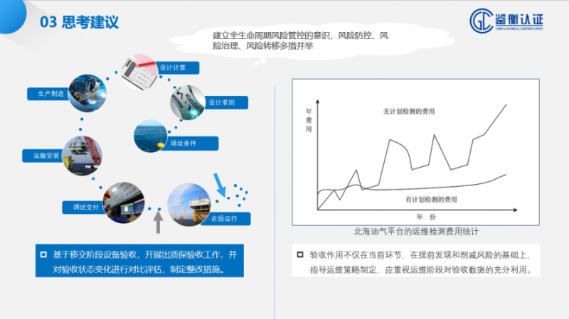 以往企业更多的从流程控制的角度,能够对工程领域具有普遍性的风险有很好的控制,对于设备的专项风险控制较为薄弱,鉴衡根据多年的海上风电技术研究和检测工作,在现有验收流程的基础上,提出了基于标准和风险分析的海上风电设备验收的总体思路,对于风电标准与海上风电风险的深度研究至关重要。通过有效合理的设备验收,将验收环节把控到位,提前规避风险,为运维期制定合理的维护计划,能够在充分考虑风险管控和最优成本的前提下,为海上风电场健康平稳运行保驾护航。在这里主要介绍5个方面——海上风电机组风险与验收、机组支撑结构风险与验收、海上升压站风险与验收、海底电缆风险与验收、验收模式及体系。
