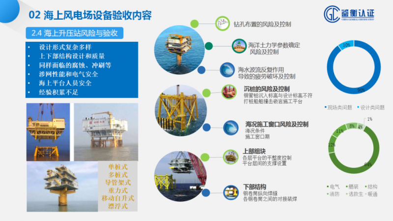 海上升压站设计形式复杂多样,上下部均应关注结构设计和质量,同样面临的腐蚀、冲刷等;此外还应重视涉网性能和电气安全,海上平台人员安全等问题。根据统计数据显示,海上升压站出现的问题中,设计类问题占10%,而现场类问题占到了90%,其中,电气类问题占比最多。我们在海上升压站验收时,有两大模块:升压站设计与过程文件审查,升压站设备质量检查与检测。
