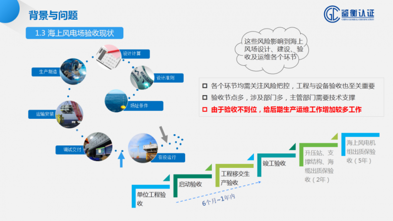 我今天分享的主题是海上风电场设备验收,一共分为三个部分,分别是海上风电设备验收的背景及存在问题、设备验收内容、以及针对行业开展设备验收的一些思考建议。