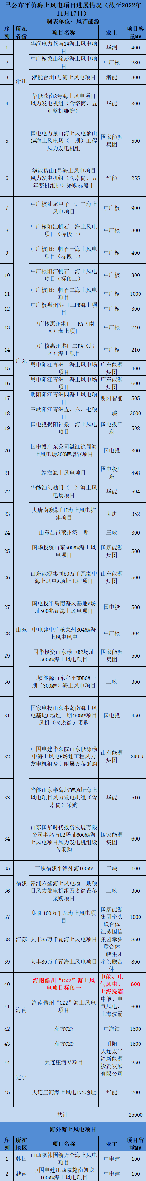 根据公开信息不完全统计,截至目前,已有25GW平价海上风电项目稳步推进中。