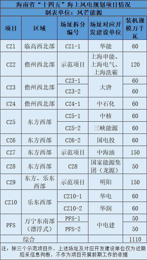 根据招采信息判断,目前,海南海上风电已有11.1GW场址对应开发建设单位浮出水面。