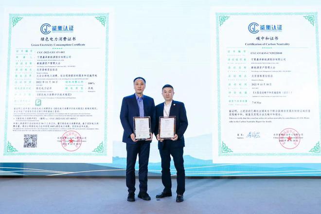 为了践行绿色发展的理念,通过核算本次大会的碳排放量,会议购买了相应的绿电,并委托北京鉴衡认证中心技术团队完成了核算与认证,使本次大会成为一次碳中和的会议。会上,北京鉴衡认证中心向宁夏嘉泽新能源股份有限公司颁发了绿色电力消费证书和碳中和两个证书。