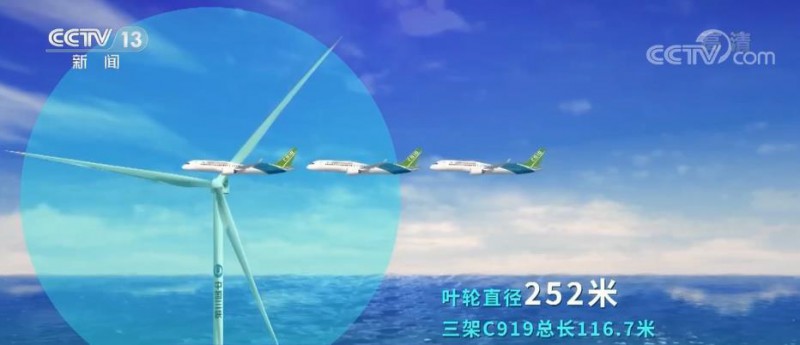 叶轮直径252米,三架C919总长116.7米,扫风面积近7个足球场大小。