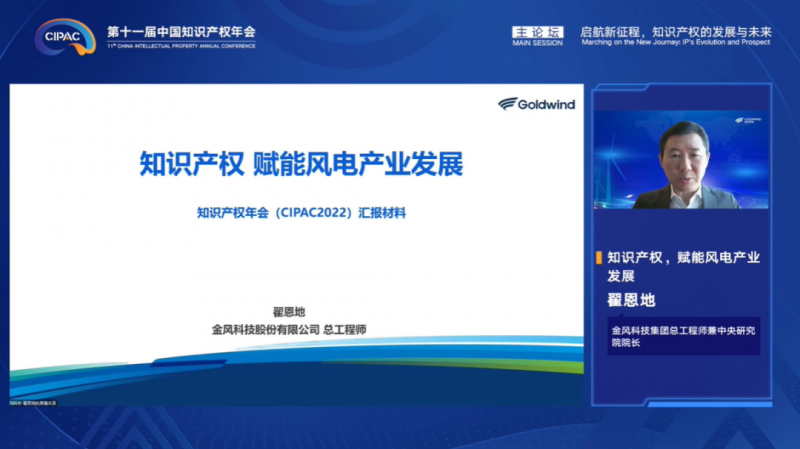 近日,第十一届中国知识产权年会(CIPAC2022)以线上形式开幕,大会以“贯彻党的二十大精神,加快知识产权强国建设”为主题,吸引了来自世界知识产权组织等国际和地区组织、政府、知识产权服务机构、高校、科研院所、企业界代表相聚“云”端,探讨新时代背景下,知识产权与经济、社会、科技、文化、贸易、对外关系等方面的融合发展。金风科技集团总工程师翟恩地受邀在“启航新征程,知识产权的发展与未来”主论坛发表演讲并参与高端对话。