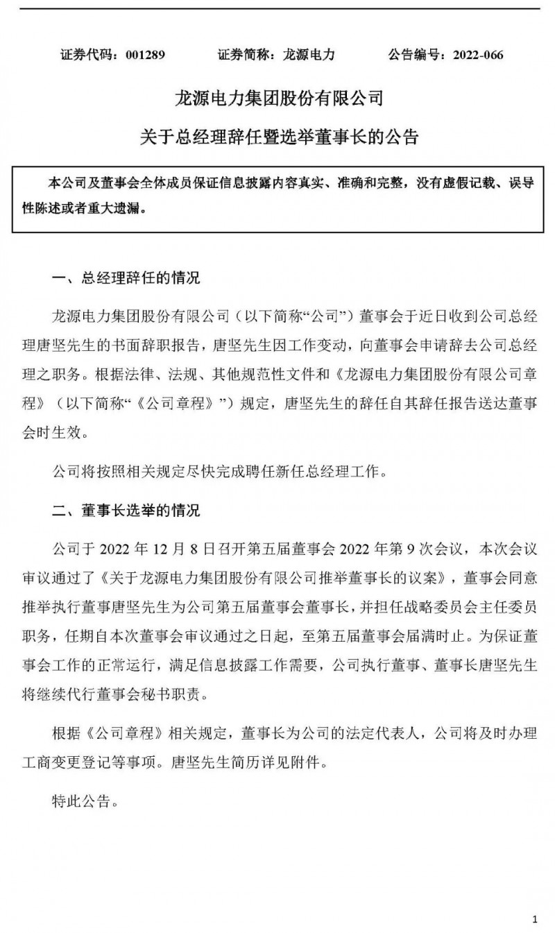 12月8日,龙源电力发布公告:董事会于2022年12月8日召开会议,推选唐坚担任公司第五届董事会董事长及董事会战略委员会主任职务,任期自董事会审议通过之日起,至第五届董事会届满时止。此外,董事会于2022年12月8日收到公司总经理唐坚的书面辞职报告,唐坚因工作变动,向董事会申请辞去公司总经理的职务。