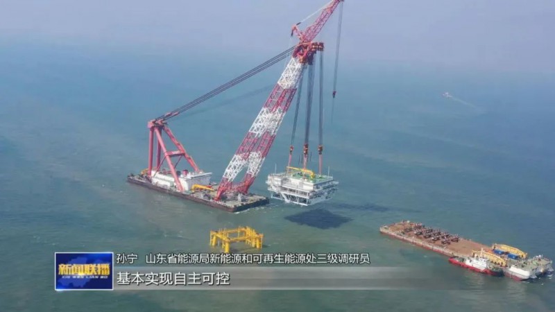 风机是海上风电产业装备的龙头。根据规划,山东将整合优势力量,建设海上风电技术创新中心,开展关键核心技术攻关和产品研发设计,提升海上风电装备产业自主创新能力。东营市广利临港产业园有限公司董事长赵磊:“整机的在全球的领先的地位,必然要依靠配套产业的一个支撑。同时技术上的领先需要认证中心的升级,也需要一大批的技术人才在我们这里集聚,所以就带动我们在全产业链上的创新突破。”在向海上风电装备技术顶峰冲刺同时,山东也在不断对海上风电装备补链、强链、延链。在烟台蓬莱,海上风电母港基地正在进行扩建。当地提前规划布局,在叶片、塔筒等装备继续提升产能的同时,投资达10亿元的上海电气风电整机项目正加紧建设。上海电气蓬莱基地项目负责人徐少华:“我们整个项目厂房所有的钢结构都已经完成安装,预计在2023年3月份我们这个项目具备试生产的能力。明年我们已经排产了100台,100台都是我们8.5兆瓦的海上风力发电机。”