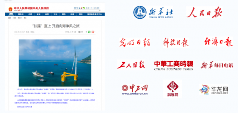 与传统固定式风电相比,“扶摇号”浮式风电装备可应用于平均水深超过50米的深海海域,同时具备环境适应性强、浮式机组功率国内最大、浮体结构形式简单、系泊锚固系统可靠性高、一体化设计等先进性,面世以来先后被人民日报、新华社、经济日报、科技日报等十余家主流媒体报道,并亮相了汉堡国际风能展和“奋进新时代”主题成就展,受到国内外广泛关注。